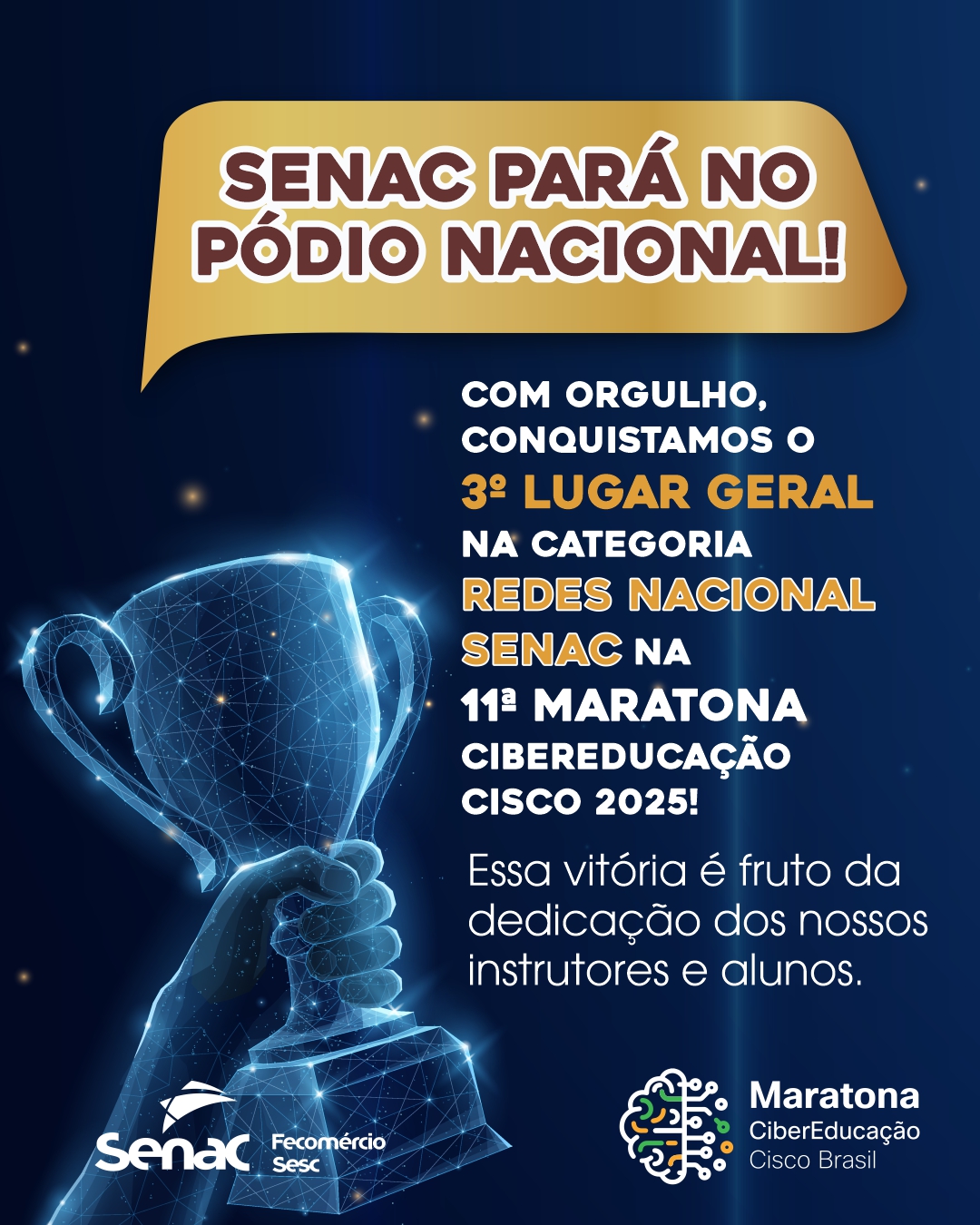 🏆 O Pará no pódio da 11ª Maratona CiberEducação da Cisco! 💻 O talento e a dedicação dos nossos instrutores garantiram o 3º lugar nacional na categoria Redes Nacional Senac, reforçando o nosso compromisso com a formação de profissionais preparados para os desafios da tecnologia e da inovação. 👏 Parabéns aos docentes Kleison Paiva, Joana Darc e Simone Amaral por representarem o Pará com excelência e inspirarem nossos alunos a irem cada vez mais longe!…