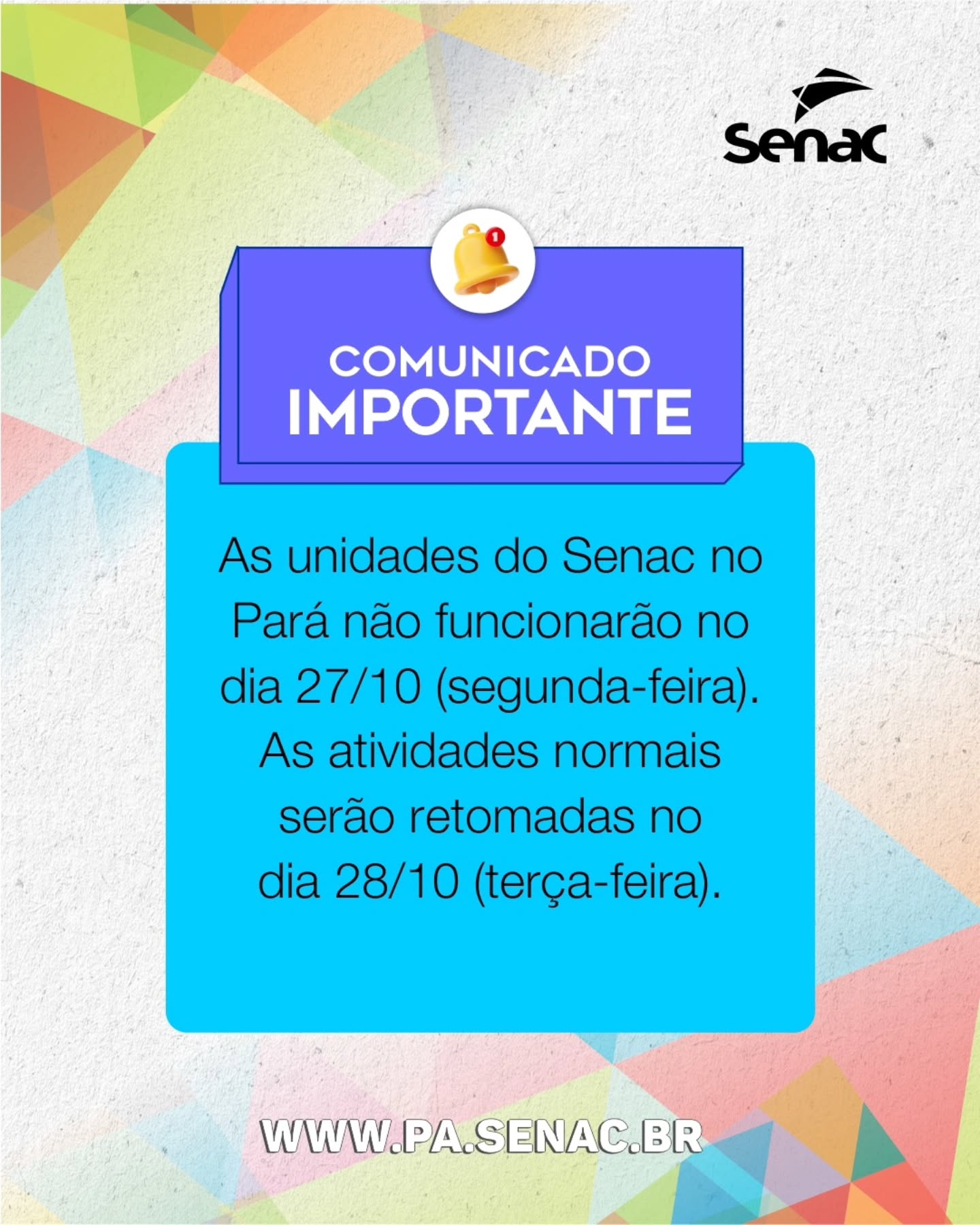 📍Em virtude do Dia do Comerciário, comunicamos que todas as unidades do Senac no Pará não funcionarão no dia 27/10 (segunda-feira), retornando às atividades normais no dia 28/10, terça-feira.